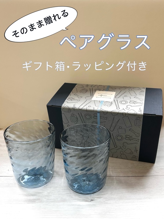 能登藍(のとブルー) Swirl(スワール)グラスペア *ラッピング込みの商品となっております。 グラスサイズ:ф80mm×H90mm(手作りの為、サイズは目安となります) 材 質:ソーダガラス(耐熱ではございません) <商品説明> 工房オリジナルカラーである「能登藍(のとブルー)」で制作したグラスになります。主張しすぎない淡く落ち着いた色合いです。「swirl」は渦巻くを意味します。深く包み込むようなイメージで制作しました。とても使いやすい日常使いにお薦めのグラスです。 峯本貴則 作 ※モニターの発色により実際の色とは異なる場合があります。 <取扱い上の注意> ●高い所から落とす等、急激な衝撃を与えないでください。 ●急激な温度差で割れることがあります。 ●洗浄の際は、研磨剤入りたわし、金属たわしやクレンザーはガラスにキズをつけ破損の原因になりますので使用しないでください。