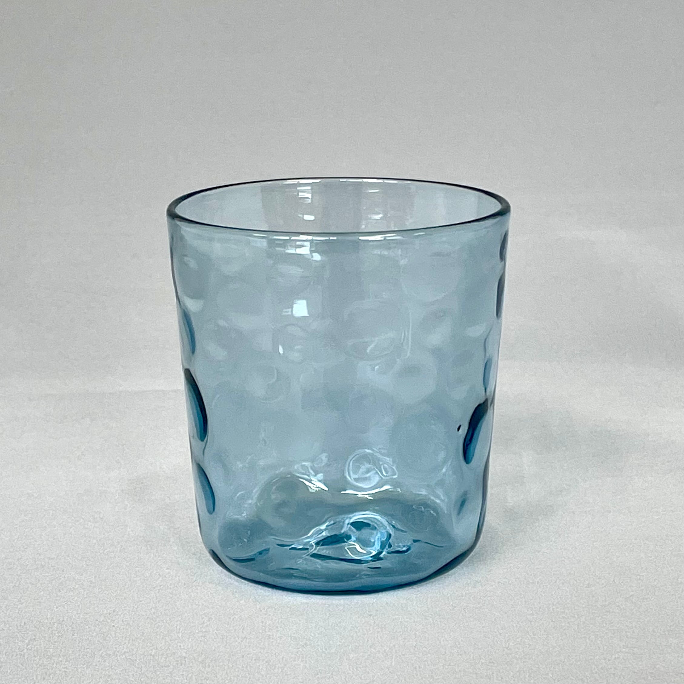 工房オリジナルカラーである「能登藍(のとブルー)」で制作したグラスになります。主張しすぎない淡く落ち着いた色合いに、丸いドットのレリーフがアクセントとなった日常使いにお薦めのグラスです。