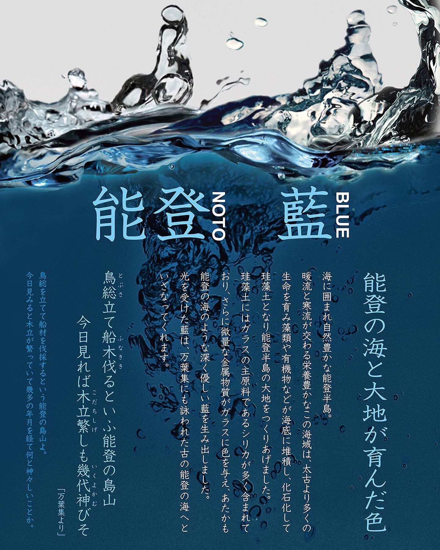 工房オリジナルカラーである「能登藍(のとブルー)」で制作したグラスになります。主張しすぎない淡く落ち着いた色合いで、口元の気泡とゆらめきが能登の海を感じさせるグラスです。
