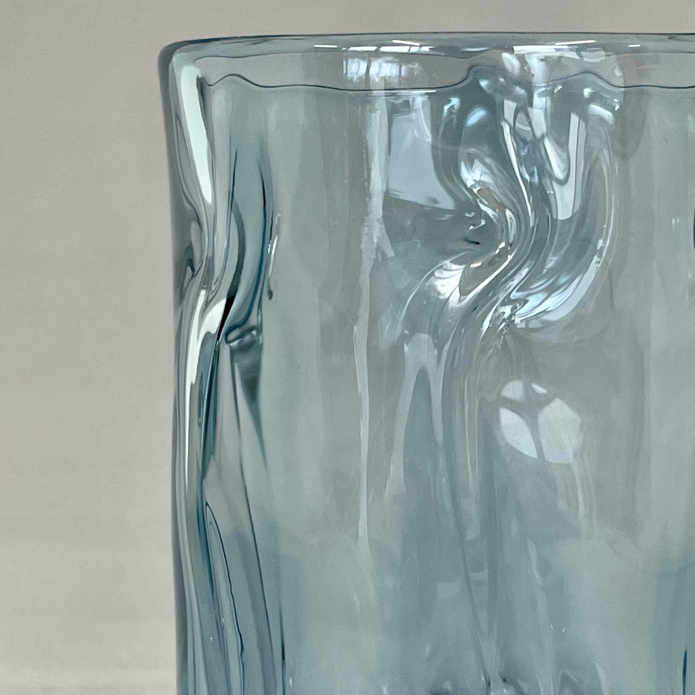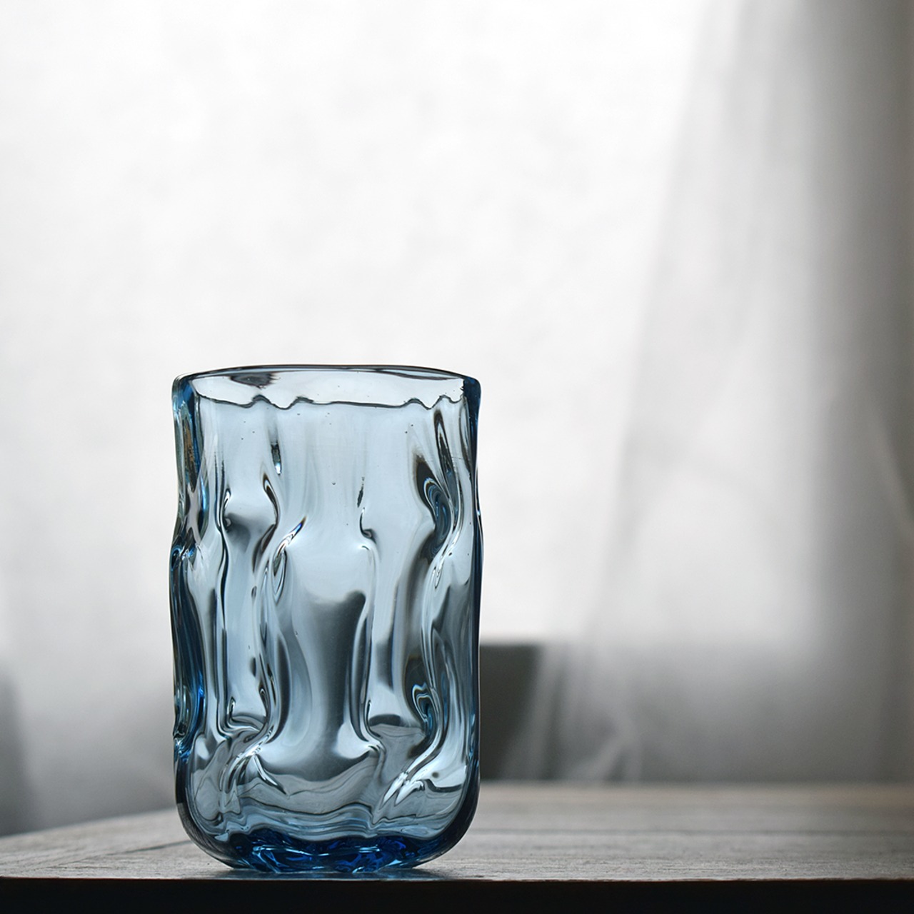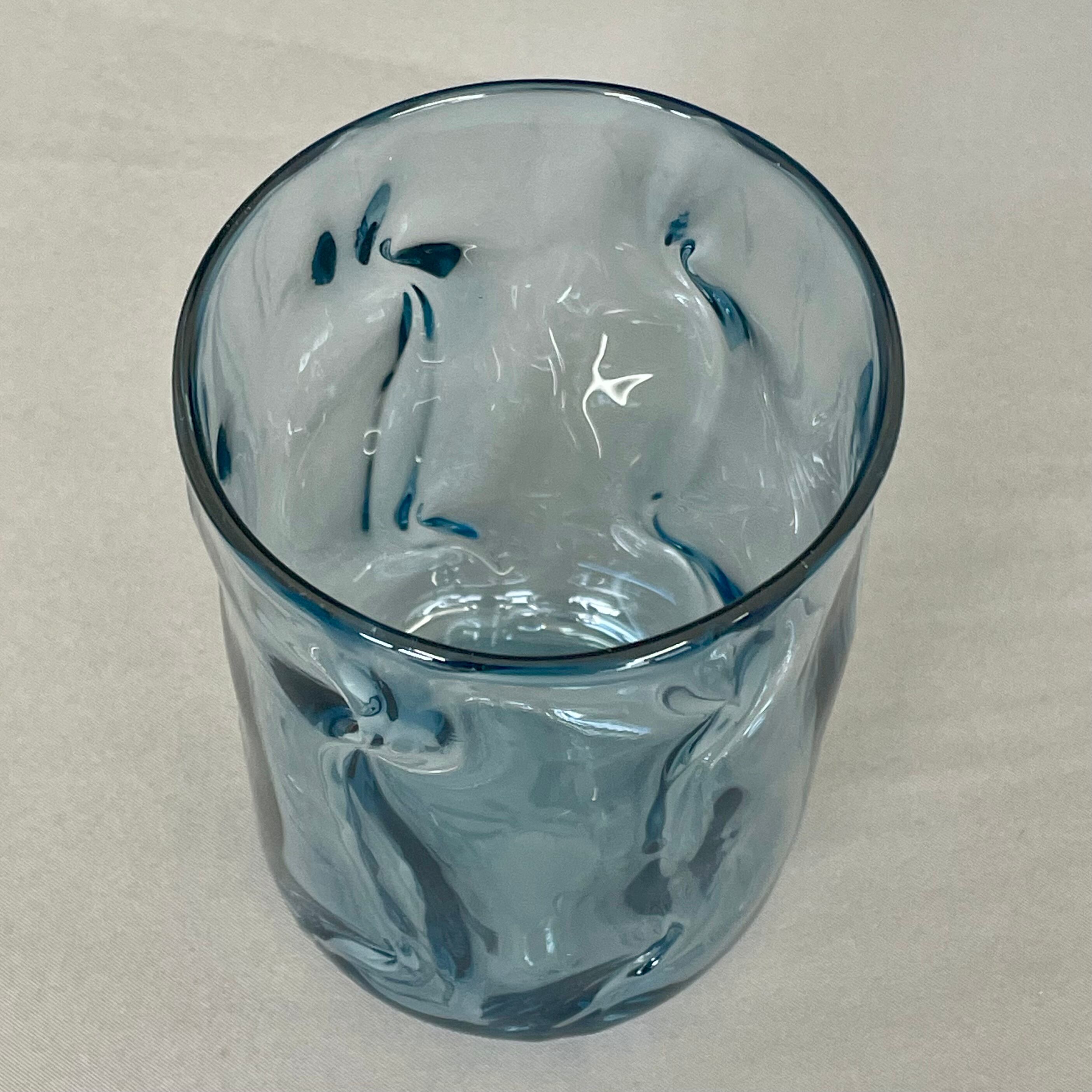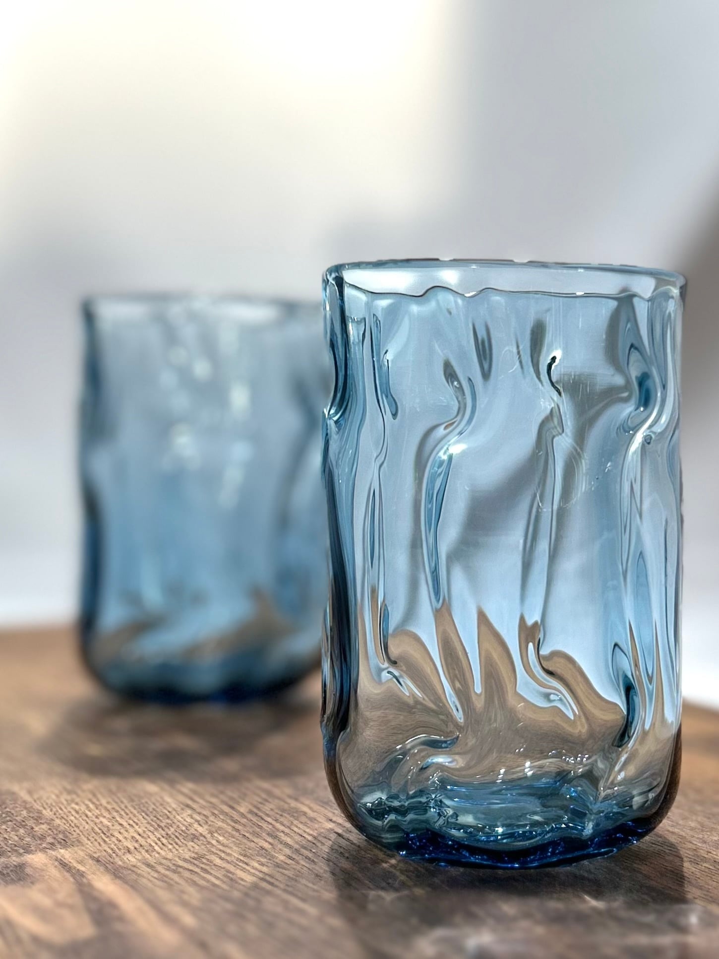 工房オリジナルカラーである「能登藍(のとブルー)」で制作したグラスになります。主張しすぎない淡く落ち着いた色合いなので、薪をイメージした少し無骨な感じの中にも柔らかさのあるグラスです。